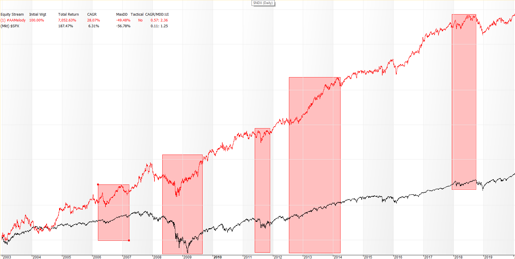 Methodology – Each month the 100 stocks in the Nasdaq 100 Index (NDX) are evaluated using a multivariate measure of their momentum both absolute and relative to each other. Once ranked according to the proprietary metric developed by Stone Barn, several are chosen as candidates for ownership. When an opening in the roster occurs, the top-ranked unowned stock is added to the portfolio. Weak stocks that have fallen out of the top rankings are sold to create the openings for newly identified movers.